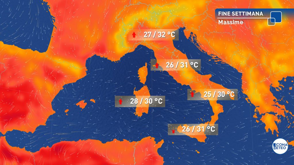 Temperature minime del primo mattino senza grandi variazioni. Temperature massime pomeridiane in aumento al Nord. Sulle regioni settentrionali, su quelle centrali tirreniche, in Umbria e Sardegna valori fino a 30-31 gradi.