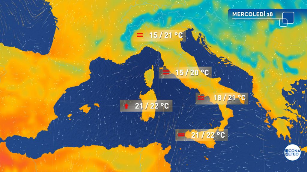 Temperature che restano in generale oltre la norma con valori massimi pomeridiani anche leggermente oltre i 20 gradi su regioni tirreniche, Sardegna e Sicilia.