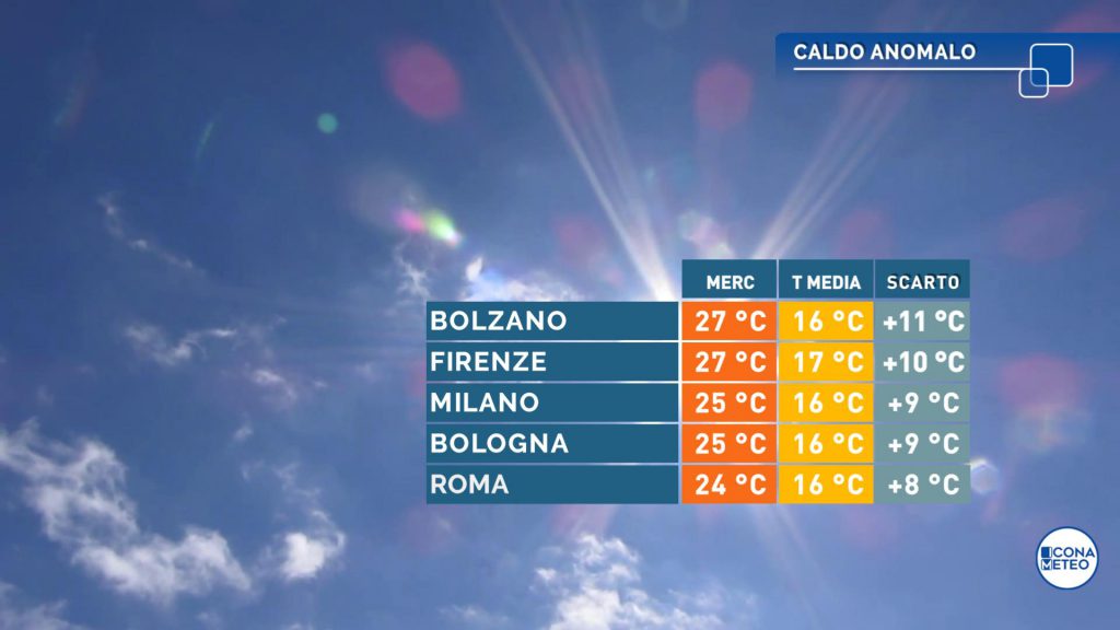 Sarà un’altra giornata prevalentemente soleggiata e caratterizzata da temperature sopra le media stagionali. Qualche velatura passeggera dapprima al Nordovest in trasferimento verso il Nordest e parte del Centro. Lungo l’Appennino centromeridionale e sui monti della Sicilia un po’ di cumuli in sviluppo nelle ore più calde della giornata, con la possibilità di occasionali scrosci di pioggia sul settore abruzzese.