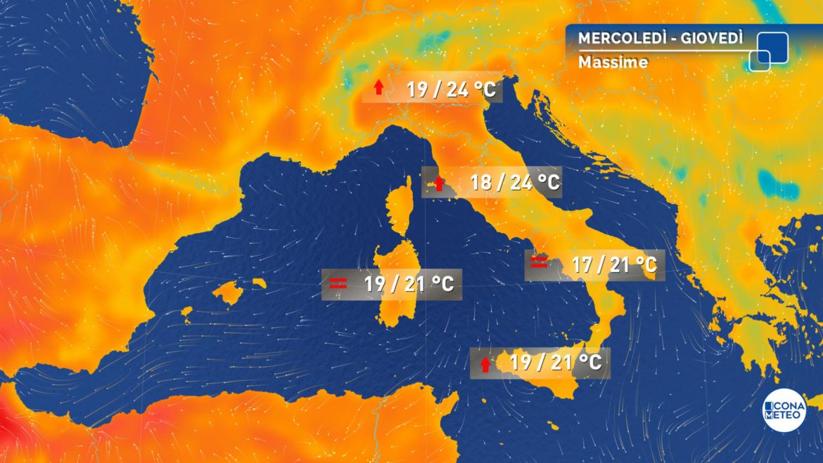 Temperature: in lieve ulteriore rialzo nei valori minimi al Centro Nord; massime in lieve aumento sulla Sardegna orientale, stazionarie altrove. Punte fino 23-25 gradi al Nord e in Toscana. Venti quasi ovunque deboli. Mari: calmi o poco mossi.