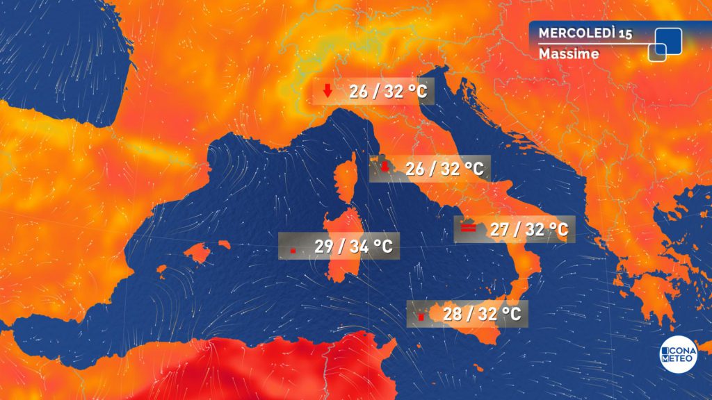 Temperature minime in rialzo al Nord e sulla Sardegna; massime in lieve calo al Nord, in Toscana e Umbria; in lieve aumento all’estremo Sud e sulle isole, specie in Sardegna. Valori ovunque superiori alla norma, particolarmente sulla Sardegna dove, localmente, si potranno raggiungere i 35 gradi con un caldo estivo.