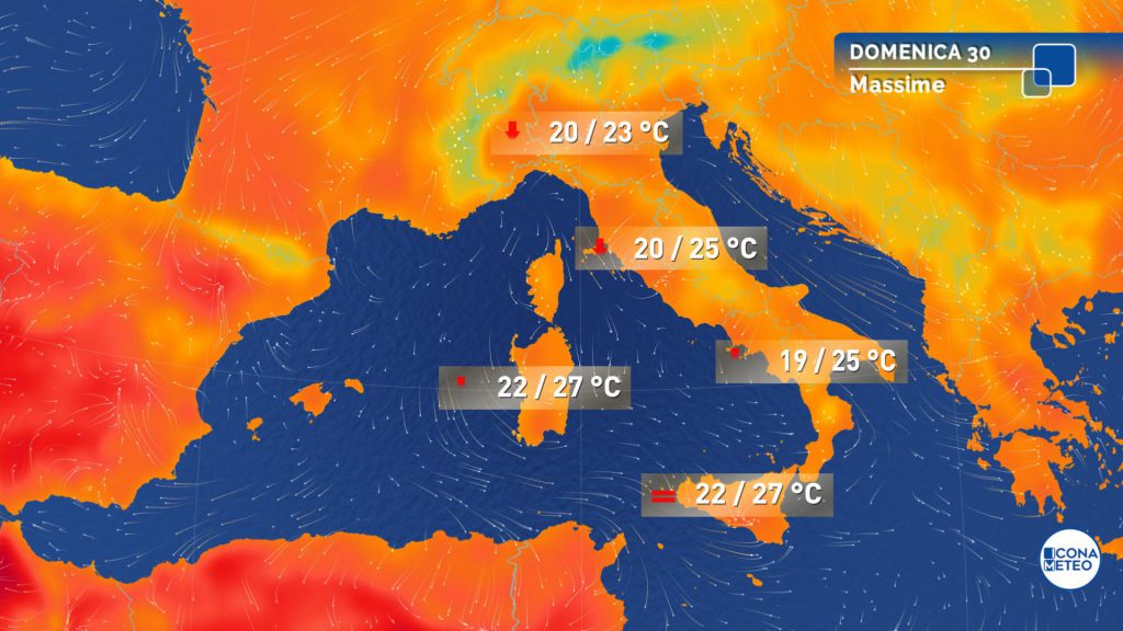 Temperature: senza grandi variazioni nelle isole; in calo altrove. Il clima resta primaverile, con valori generalmente compresi tra 19 e 25 gradi. Venti: di debole o al più moderata intensità. Mari generalmente poco mossi o mossi.