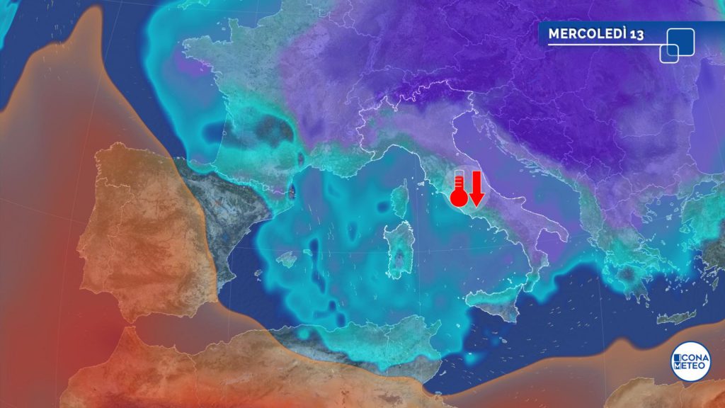 Temperature massime quasi ovunque in leggera diminuzione con valori in generale sotto la media: valori fra i 15 e i 19 gradi al Centro-Nord, 16-21 al Sud e sulle Isole.
