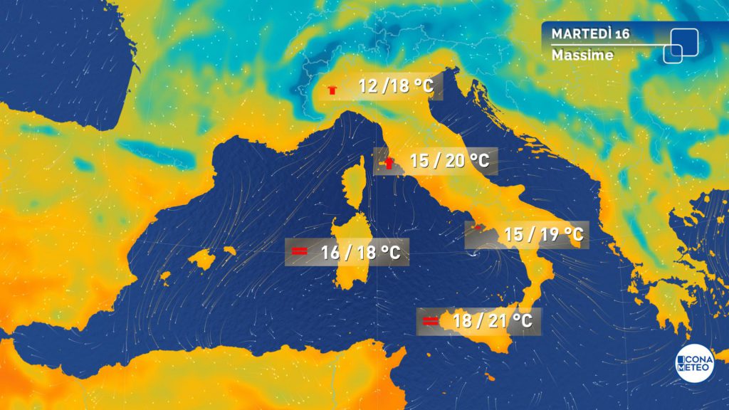 Temperature massime in rialzo nelle regioni centrali, in lieve calo al Sud e Sicilia, senza grandi variazioni altrove; valori in generale intorno alle medie stagionali.