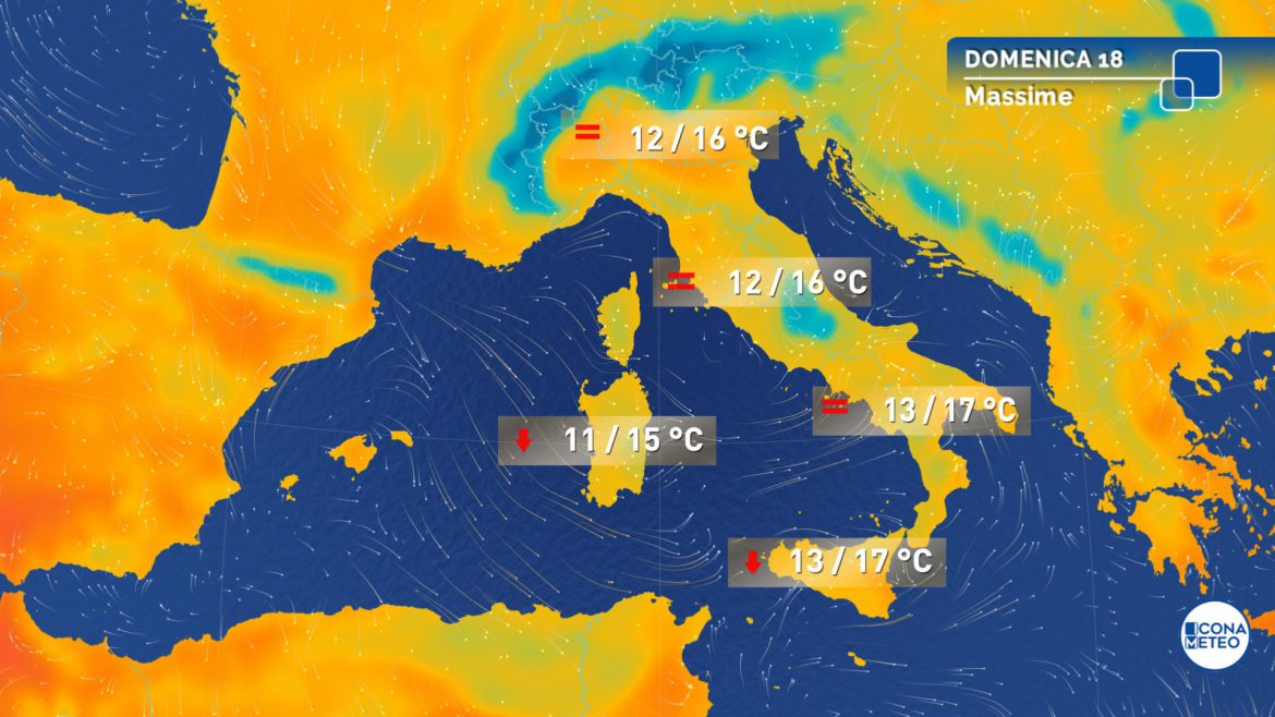 Temperature: minime in aumento al Centro-Nord. Massime per lo più in lieve rialzo al Sud e in Sicilia, in lieve calo sulle regioni centrali tirreniche e localmente anche al Nord; valori in generale sotto le medie stagionali.