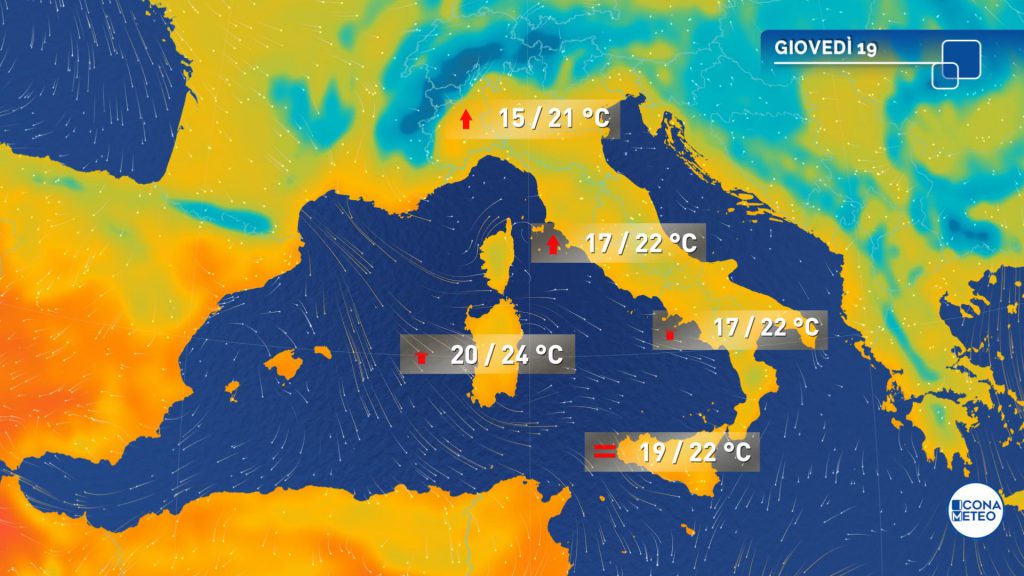 Temperature minime in rialzo, tranne al Sud e in Sicilia. Massime in sensibile calo sul settore alpino, al Centro e in Sardegna; valori più vicini alla media, eccetto al Nord-Ovest dove restano relativamente miti.