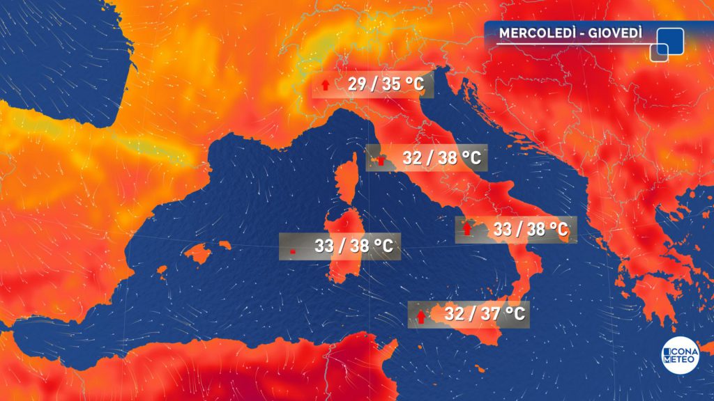 Temperature: in ulteriore aumento quasi ovunque. Valori per lo più compresi tra 30 e 37 gradi in Emilia Romagna, sulle regioni peninsulari e insulari; tra 28 e 34 gradi nel resto del Nord, dove aumenta il disagio dovuto all’afa. Picchi fino a 38-40 gradi nelle aree interne del Centro-Sud, della Sardegna e della Sicilia.