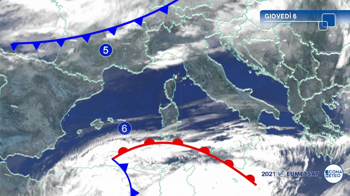 Al mattino tempo prevalentemente soleggiato sulle regioni centro meridionali con un po’ di nuvole solo su alta Toscana, nord delle Marche, Calabria e Sicilia; schiarite sulle pianure dell’estremo Nord-Ovest e sul Ponente Ligure. Piogge sparse sulle Alpi centro orientali; piogge isolate nell’interno del Levante Ligure e del nordovest della Toscana. In giornata il transito del fronte freddo darà origine a qualche rovescio o isolato temporale anche sulle Prealpi e pianure del Nord-Est, specie su Friuli Venezia Giulia e Veneto orientale, mentre migliora in gran parte del Nord-Ovest; pochi e occasionali piovaschi sull’Emilia. In Sicilia possibili rovesci isolati sui rilievi.