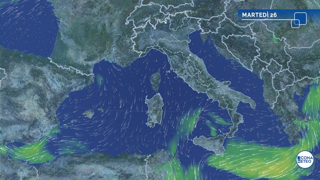 Venti: da nord o nordest, in prevalenza moderati su tutti i mari e sulle regioni centro-meridionali, con rinforzi tra Toscana, Umbria e Marche; fino a molto forti o burrascosi tra lo Ionio meridionale e il Canale di Sicilia, con raffiche sui 70-80 Km/h.