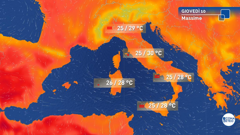 Temperature massime stazionarie o in lieve aumento. Clima estivo, con valori diffusamente superiori ai 25 gradi e punte vicine ai 30 gradi al Nord e nelle regioni tirreniche.