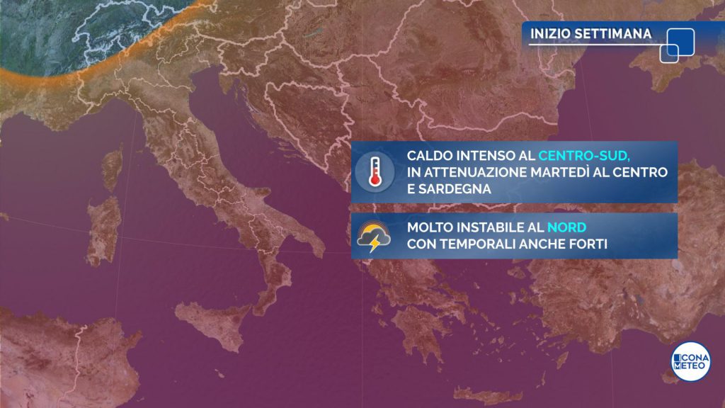 Previsioni per domani, lunedì 26 luglio: a inizio settimana maltempo al Nord e caldo intenso al Sud e in Sicilia