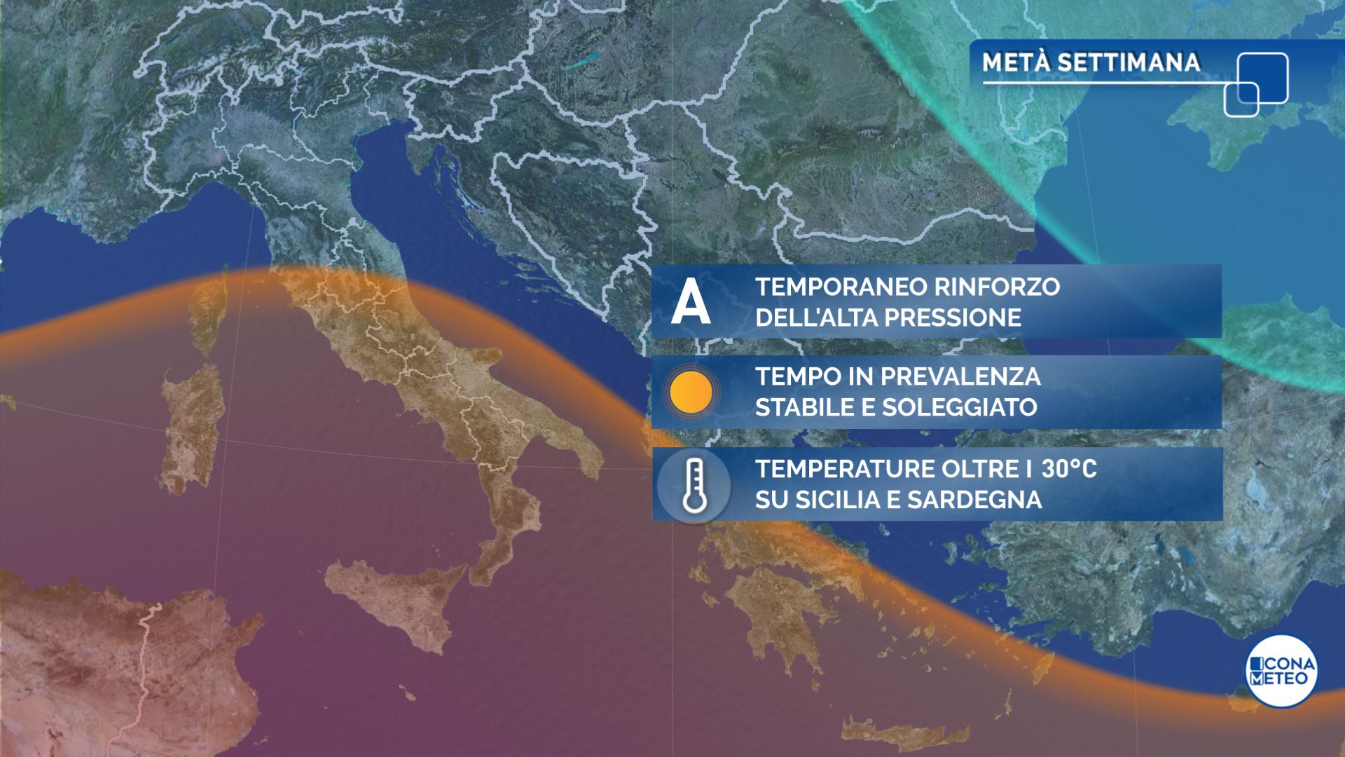 Temperature senza grandi variazioni con valori che, nel complesso, resteranno prossimi alla norma. Le regioni più calde saranno ancora una volta le due Isole maggiori, con valori anche oltre i 30 gradi, fino a sfiorare i 35°C nei settori occidentali di Sicilia e Sardegna.