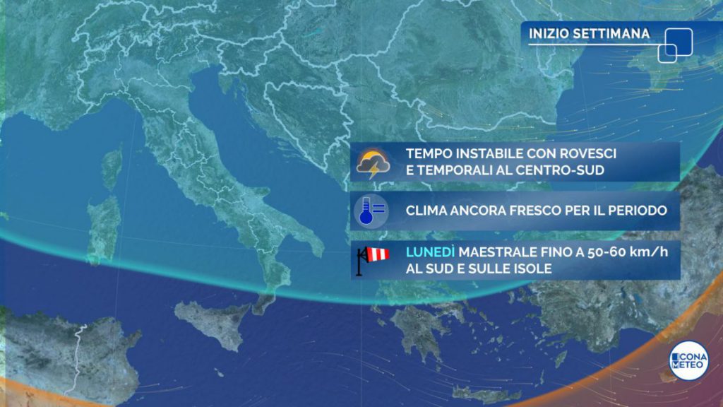 Meteo per le prossime ore: persiste il tempo instabile a inizio settimana, con piogge principalmente sulle Isole e al Centro-Sud