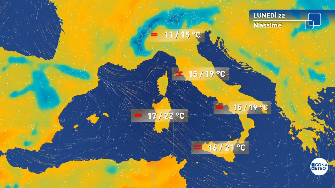 Temperature senza grandi variazioni con valori in generale sopra la media: punte di 15-16 gradi al Nord, 18-19 gradi al Centro-Sud e localmente oltre i 20 gradi in Sardegna.