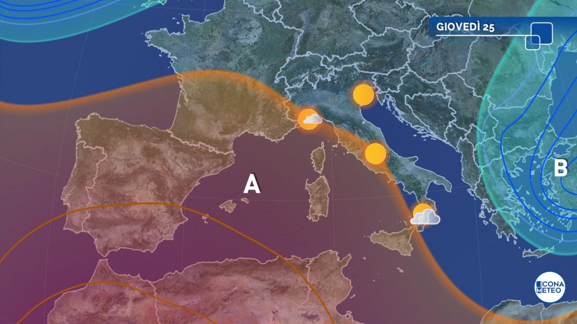 Al mattino il tempo sarà stabile e soleggiato, con solo un po’ di nuvole in Liguria, Salento, Calabria e Sicilia. Dal pomeriggio nubi in aumento al Nord-Ovest, in Toscana e in generale sulle aree montuose; non si esclude che deboli piogge isolate coinvolgano la zona delle Prealpi centrali e il Levante Ligure.