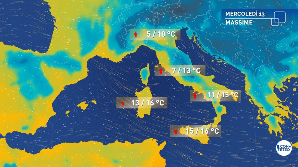 Temperature: per lo più in aumento, sia le minime che le massime. Deboli gelate all’alba al Nord e nelle aree interne del Centro.