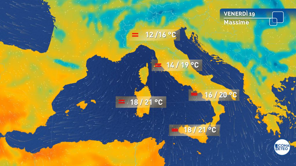 Temperature in leggero aumento nel settore alpino, senza notevoli variazioni altrove. Massime in generale nella norma o leggermente al di sopra, con punte di 18-20 gradi sulle regioni centrali tirreniche, in Calabria e sulle Isole.