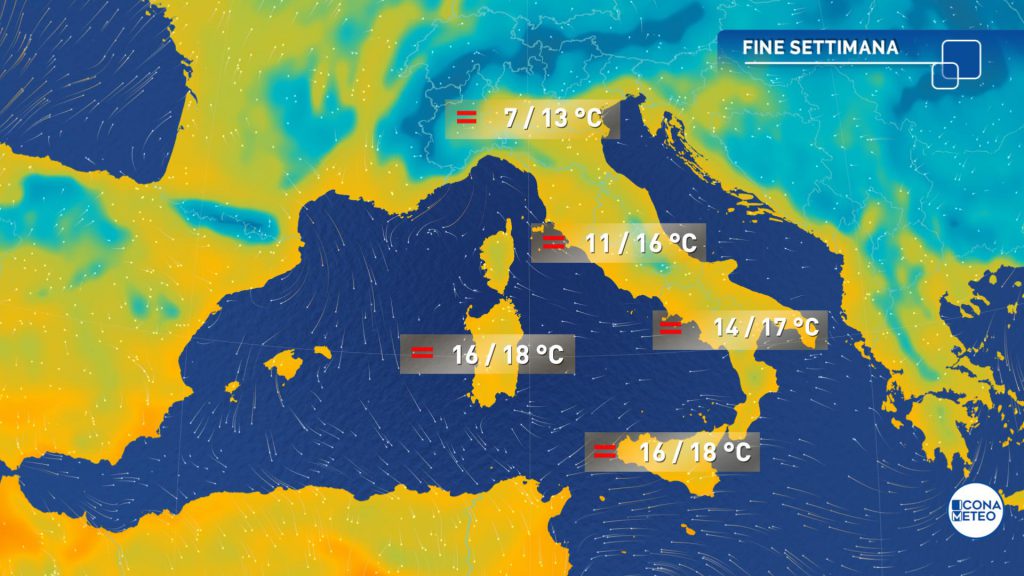 Temperature massime senza variazioni significative, oltre le medie e con punte massime fino a 17-18 gradi in Calabria, Sicilia e Sardegna. Venti da deboli a localmente moderati di Scirocco sui mari di ponente e nello Ionio meridionale, fino a tesi nel Canale di Sicilia e di Sardegna; venti molto deboli o del tutto assenti altrove. Mari: da poco mossi a localmente mossi i bacini ad ovest della Penisola e il basso Ionio, fino a molto mosso il Canale di Sicilia; calmi o poco mossi tutti gli altri.