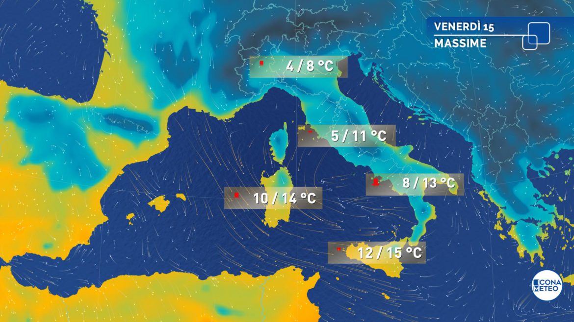 Meteo per domani, venerdì 15 gennaio: arriva il freddo dalla Russia e le temperature calano in gran parte d’Italia. Veloce perturbazione all’estremo Sud e sulle Isole. Ancora forti venti di Maestrale in Sardegna e Sicilia