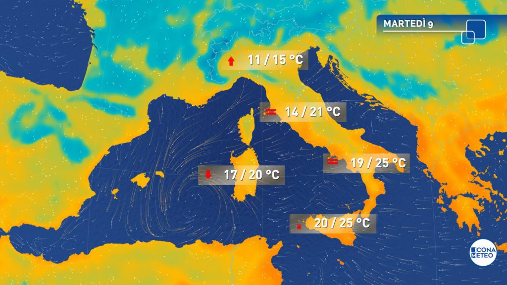 Temperature per lo più in lieve aumento su Centro Nord, Sardegna, Campania e nord Puglia. Clima mite per il periodo al Centro-Sud, particolarmente sul lato tirrenico, al Sud e sulle Isole dove si supereranno ancora i 20 gradi.