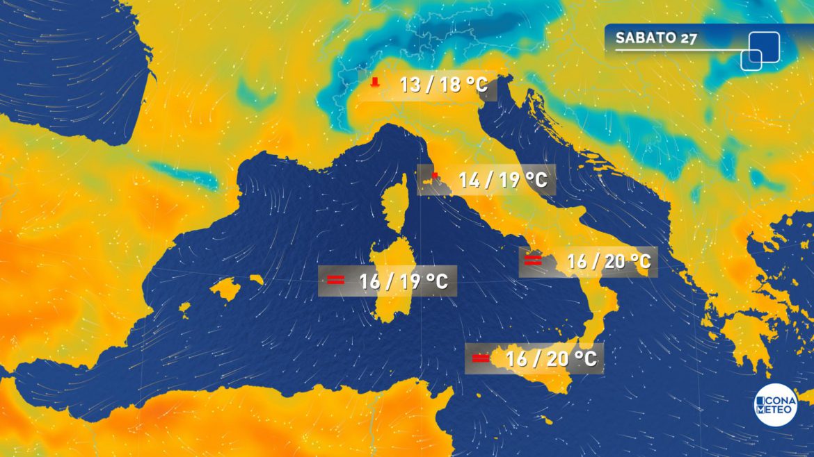 Temperature: massime in diminuzione (anche di 6-7 gradi) al Nord, sulle regioni adriatiche, in Umbria e Basilicata; altrove i cali saranno ben più contenuti. Valori per lo più ancora oltre la norma: punte di 18-20 gradi sul versante tirrenico, Calabria e Isole.