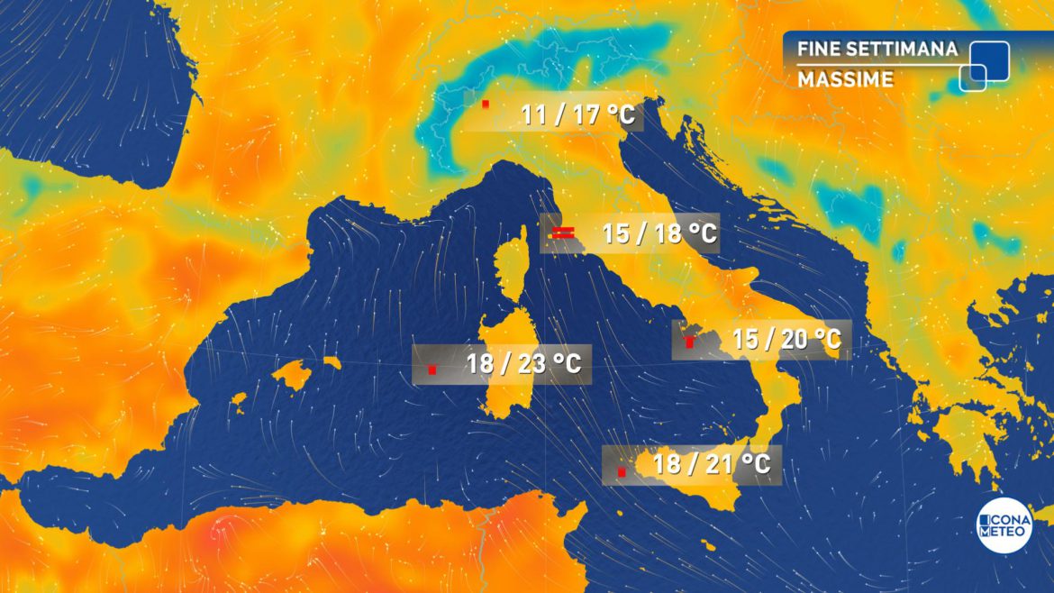 Temperature minime in generale lieve crescita; massime in ulteriore lieve crescita al Sud e nelle Isole maggiori con valori pomeridiani fino a 18-20 gradi; lieve calo al Nord-Est e in Lombardia, senza grandi variazioni al Nord-Ovest.