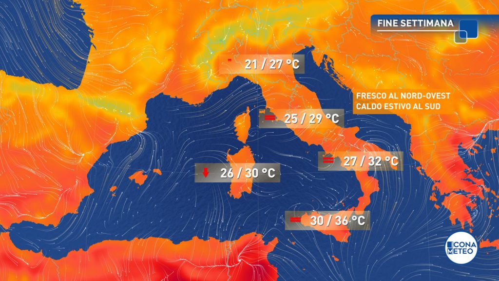 Temperature senza grandi variazioni e ancora superiori alla norma. Caldo anomalo al Sud, con punte massime fino a 35-36 gradi su Calabria e Sicilia.