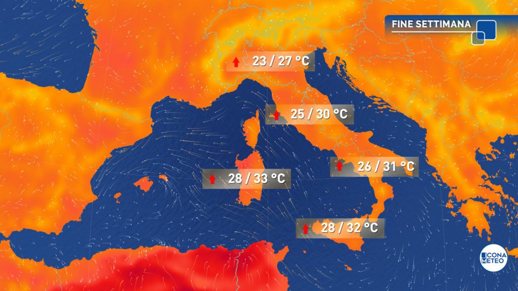 Temperature superiori alla norma del periodo in quasi tutte le regioni, con massime fino a 28-30 gradi nelle regioni centrali tirreniche e al Sud, e possibili picchi di 32-34 gradi nelle Isole.