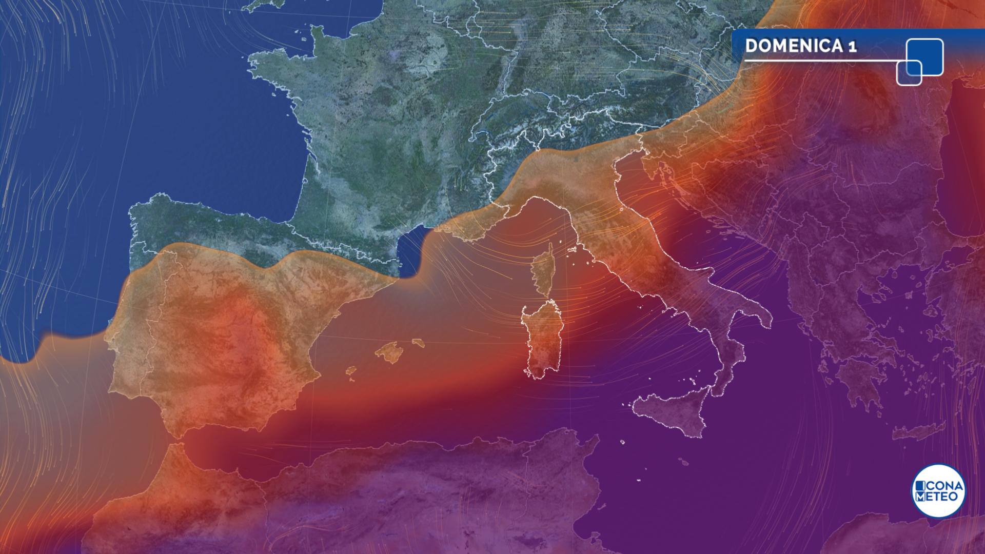 Temperature fino a 10 gradi superiori alle medie stagionali, con i valori più alti al Sud e nelle due Isole maggiori e punte anche oltre i 40°C; al Nord valori più contenuti, ma con clima afoso.
