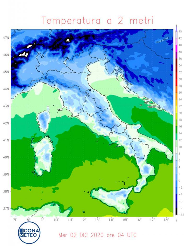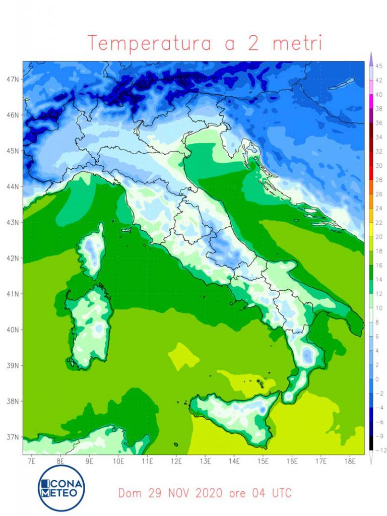 Rispetto alla giornata di domenica 29 novembre, le temperature sono destinate a calare sensibilmente da Nord a Sud. Entro giovedì, infatti, al Nord all’alba le temperature potranno scendere su valori vicino o anche al di sotto dello zero, mentre le massime non supereranno i 10 gradi.