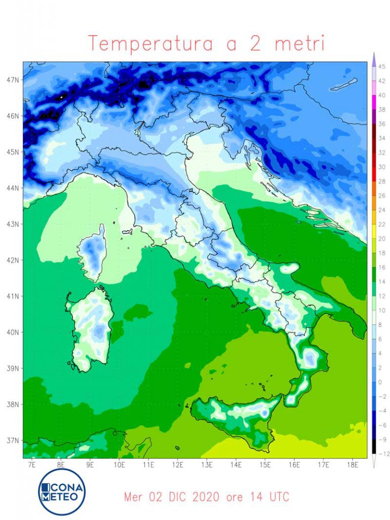 Al Sud e sulle Isole le temperature minime resteranno pressoché invariate, mentre perderanno qualche grado nei valori massimi: al Sud, dai 16-18 gradi di oggi, scenderanno intorno ai 13-15 gradi; in Sicilia, dai 19-20 gradi di oggi, si porteranno intorno ai 15-16 gradi; in Sardegna, dai 16-18 di oggi, si porteranno intorno ai 12-13 gradi.