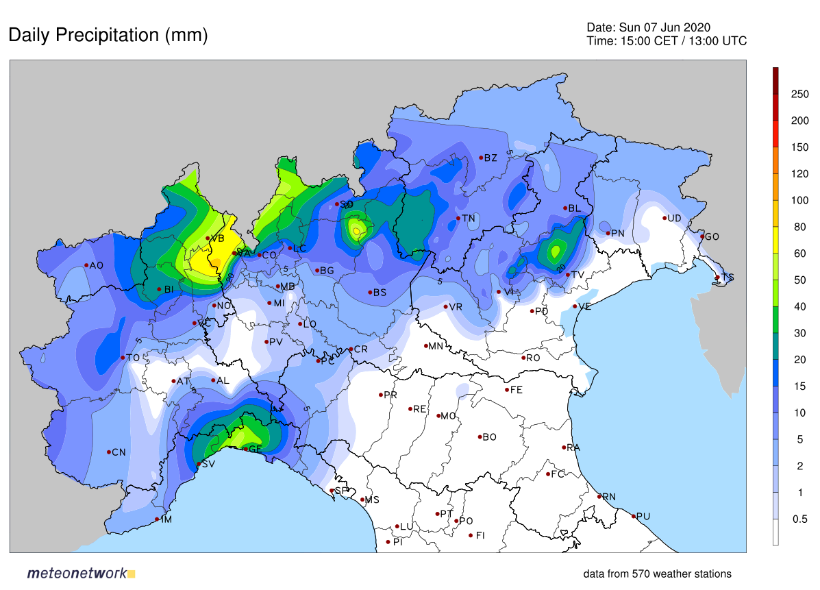 Nella zona del Lago Maggiore e del Lago di Varese sono caduti gli accumuli più ingenti: nelle ultime 24 ore piogge e forti temporali hanno insistito sulle stesse zone, scaricando al suolo più di 150-160 mm di pioggia.![]()