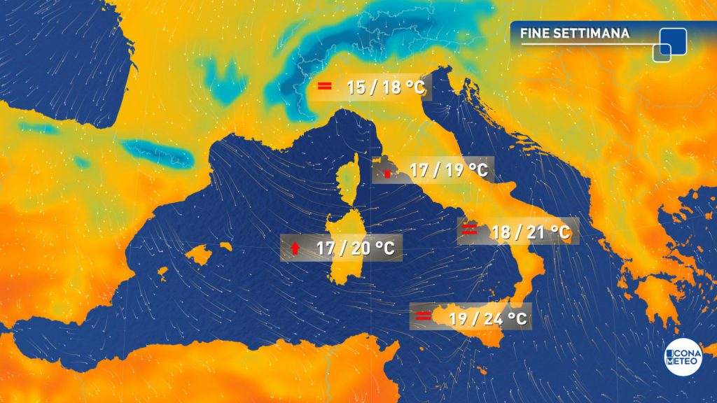 Temperature massime in lieve calo nelle regioni di Nordovest e sul settori ionici, lieve rialzo sul medio alto versante tirrenico. I valori risulteranno ancora quasi ovunque inferiori alla norma in modo più evidente al Centro-sud e sulla Sardegna (anche di 4-5 gradi) dove si resterà diffusamente al di sotto dei 20°C. Venti in attenuazione, ma localmente ancora moderati settentrionali al Sud e sulla Sicilia.