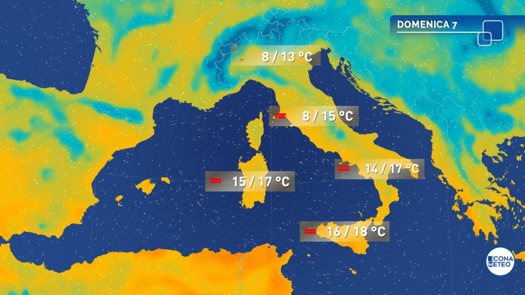 Temperature minime in lieve aumento nelle Isole, in calo al Centro-Nord con qualche locale debole gelata anche in pianura al Nord. Massime in rialzo di 1-3 gradi nelle aree più soleggiate delle regioni centro-settentrionali. Venti in attenuazione al Nord e al Centro; moderato Scirocco nei canali di Sicilia e di Sardegna, che saranno da mossi a molto mossi. Localmente mossi anche il basso Ionio e gli altri mari intorno alla Sardegna e alla Corsica, poco mossi o quasi calmi i rimanenti bacini.