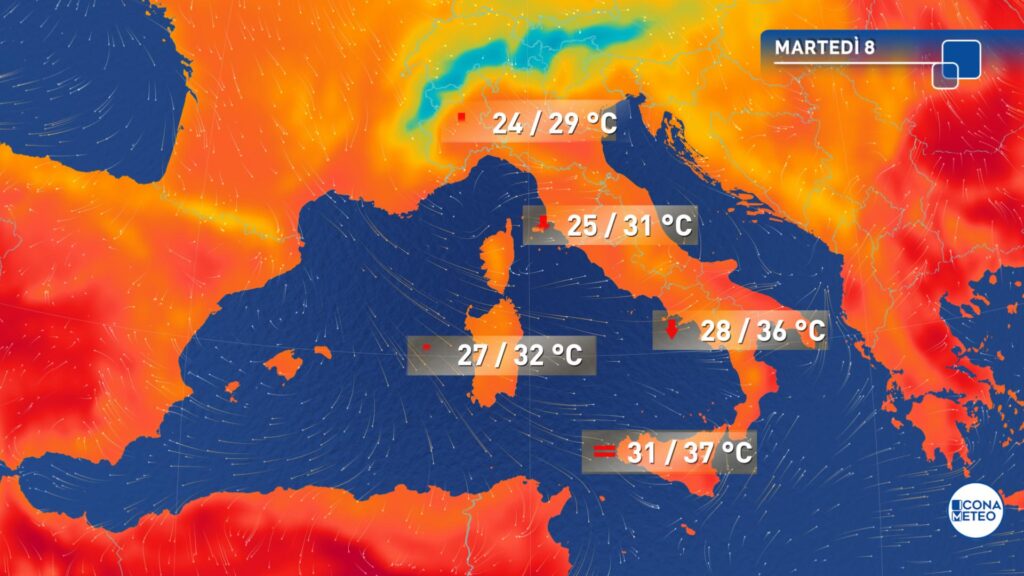 Nei giorni successivi, l’Italia sarà interessata da una fase più stabile e gradevole, con temperature inferiori alla media al Nord e lungo l’Adriatico, e mattinate fresche soprattutto sulle regioni settentrionali. Tuttavia, nel fine settimana è atteso un nuovo aumento dell’instabilità al Nord, in particolare domenica, quando i temporali potranno interessare non solo i rilievi ma anche le pianure, accompagnati da una lieve risalita delle temperature. L’evoluzione della prossima settimana resta incerta, ma per ora si prevede qualche giorno con il volto più piacevole dell’estate.