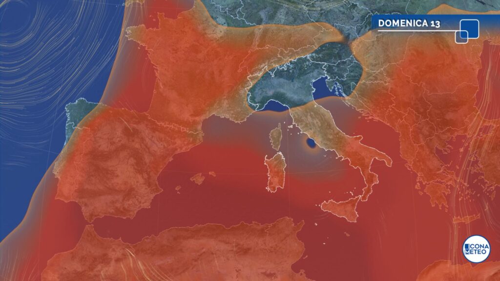 Al Nord, i valori massimi saranno stazionari o in lieve calo, con diminuzioni più sensibili nelle aree colpite dai temporali. La ventilazione si disporrà dai quadranti meridionali, soprattutto nei canali delle Isole e nel Tirreno, favorendo un ulteriore incremento termico al Sud.