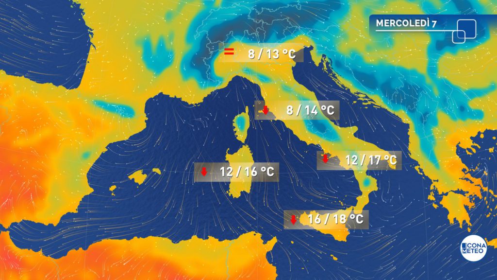 Nel pomeriggio il clima resterà freddo e di stampo invernale. Le massime pomeridiane saranno in lieve calo nelle regioni di Nord-Ovest, in rialzo al Nord-Est e in Emilia, in calo anche sensibile al Centro-Sud. Nelle regioni del Centro-Nord e in Puglia i valori saranno intorno o poco sopra i 10°C.