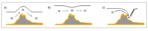 Un approccio più intuitivo per descrivere i venti tempestosi che si manifestano sottovento ad una catena montuosa è costituito dalla teoria idraulica (o del salto idraulico, “hydraulic jump”). In questa cornice descrittiva il vento che supera le montagne viene equiparato ad un sottile strato d’acqua in movimento che incontra un ostacolo: come anticipato, nonostante gli evidenti limiti, questa teoria produce risultati discreti anche sul piano quantitativo. Semplificando all’estremo, il nucleo di questa teoria consiste nel confrontare l’energia cinetica del flusso d’acqua, associata ad un gradiente orizzontale di pressione, con l’energia potenziale acquisita dal fluido mentre scavalca l’ostacolo. Il bilancio tra questi due termini viene riassunto nel Numero di Froude, definito da: Fr=U/√gD dove U è la velocità, g l’accelerazione di gravità, D lo spessore del fluido. In questo rapporto il termine a denominatore rappresenta la velocità delle onde che si sviluppano in uno strato poco profondo di fluido, a suggerire che in gioco ci sono da una parte il gradiente orizzontale di pressione che tende a forzare il fluido a salire lungo il pendio, accumulando massa sopravvento “contro” la forza di gravità, dall’altra le onde di gravità che tendono invece a redistribuire la massa. Osserviamo che tenendo fissa la profondità D del fluido il numero di Froude dipende solo dalla velocità. Si hanno tre possibilità: se Fr è maggiore di 1 si realizza la situazione a) schematizzata nella figura 5 (flusso supercritico), dove KE e PE definiscono rispettivamente l’energia cinetica e l’energia potenziale. Nel caso in cui Fr è minore di 1 (flusso subcritico) abbiamo il risultato descritto in b): il fluido è più lento e non si forma una gobba sopra il rilievo come in a); in queste condizioni in cima al rilievo l’energia potenziale acquisita si trasforma in energia cinetica ed il fluido accelera. Il caso più interessante è rappresentato in c) laddove il flusso subisce una transizione da regime subcritico a supercritico con lo sviluppo di un salto idraulico turbolento. Si noti la somiglianza della figura 5c con la foto del flusso d’acqua in laboratorio e le evidenti analogie con il comportamento dei venti illustrato nella figura 3. |