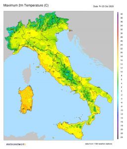 Nella giornata di giovedì 22 ottobre la Sardegna è stata la regione più calda d’Italia: il termometro ha raggiunto i 27.3 gradi ad Alghero e i 26.4 gradi a Capo Bellavista. Alghero è stata la seconda località più calda di tutta Europa, superata solo dai 27.5 gradi di Porreres a Maiorca, in Spagna.