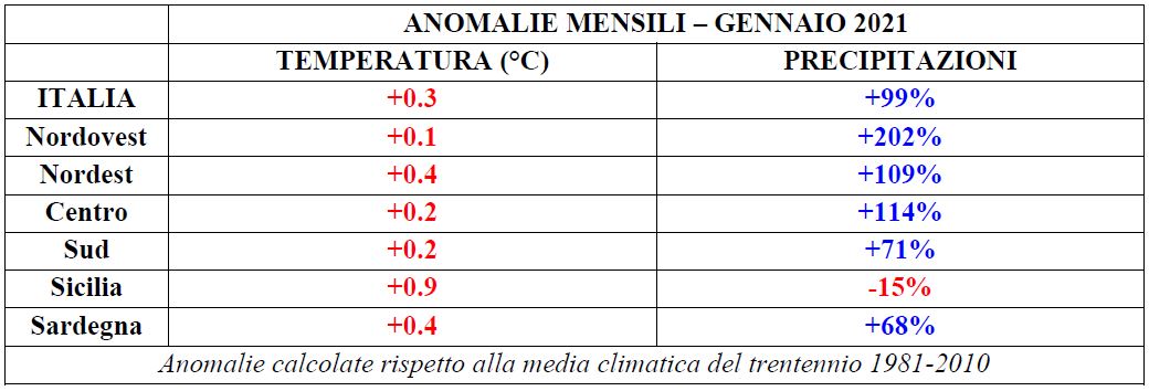 Dopo un dicembre 2020 che ha portato sull’Italia il doppio delle piogge tipiche del mese, infatti, anche il clima di gennaio è stato caratterizzato da precipitazioni particolarmente abbondanti. Il bilancio pluviometrico del mese è infatti del tutto simile a quello di dicembre, con un +99% rispetto alla media del trentennio 1981-2010: con questo dato il gennaio 2021 si piazza al sesto posto tra quelli più piovosi che siano stati registrati dal 1959.