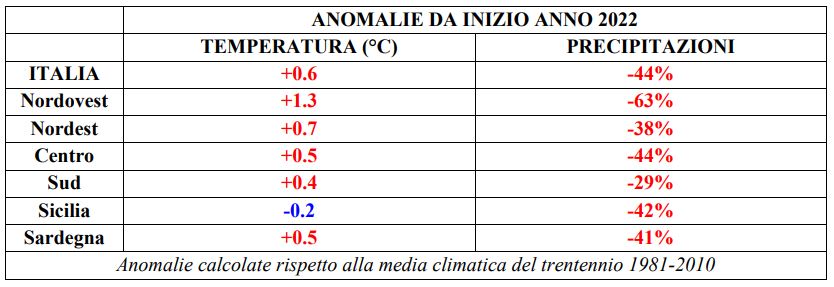Il deficit ammonta a circa un terzo delle piogge in meno rispetto alla media del trentennio 1981-2010, più esattamente -35%, determinato dalla combinazione fra gli accumuli nettamente sotto la media al Centro-Nord (-46% al Nord, -50% al Centro) e quelli mediamente più abbondanti della norma, ma di peso statistico inferiore, al Sud (+21%) e sulle Isole (+43% in Sicilia, +22% in Sardegna).