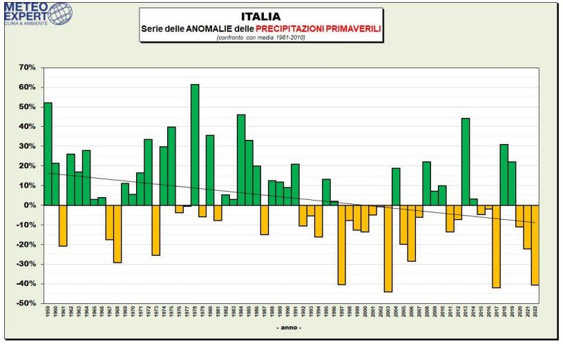 Così, la primavera del 2022 sale al 3° posto fra le più siccitose in compagnia di quella del 1997, appena sotto le prime due, quelle del 2003 (-44%) e del 2017 (-42%). Considerando, poi, solo le regioni settentrionali, si sale ulteriormente portandosi al 2° posto con un’anomalia di -50% (superata solo dal dato del 1997) che diventa -60% se ci si focalizza sulle regioni di Nord-Ovest, anch’esse al 2° posto dopo il record del 1997.