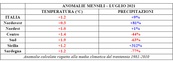 Nel mese di luglio del 2021 il clima in Italia è stato più caldo del normale. Mediamente, le temperature sono state superiori alla norma di 1,2 gradi ma con grandi differenze tra il Nord e il Sud del paese. Per buona parte del mese le condizioni meteo hanno praticamente diviso in due l’Italia, con una situazione instabile e un clima molto vicino alla media stagionale al Nord, e un caldo eccezionalmente intenso nelle regioni meridionali. Qui l’anomalia termica risulta infatti decisamente più estrema: nel mese di luglio la temperatura è stata superiore alla media di quasi 2 gradi (1.9°C).