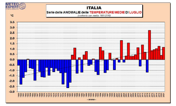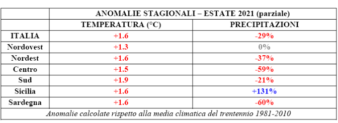 Tra valori estremi (picchi oltre i 40 gradi in Puglia, Basilicata, Calabria, Sicilia e Sardegna – sfiorato il record a Olbia con 42.1°C) e fasi al di sotto della norma, in questo quadro le temperature hanno dato origine a un’anomalia complessiva decisamente positiva: +1.2°C sopra la media che rappresenta il 6° valore più elevato dall’inizio delle registrazioni, dopo quelli del 2015 (il più caldo con +2.7°C di anomalia), 2003, 2006, 2012 e 2019, con gli scarti più elevati sulle regioni meridionali (mediamente +1.6°C fra Sud e Isole) e centrali (+1.4°C) più ostinatamente interessate dalle incursioni di aria torrida nord-africana.
