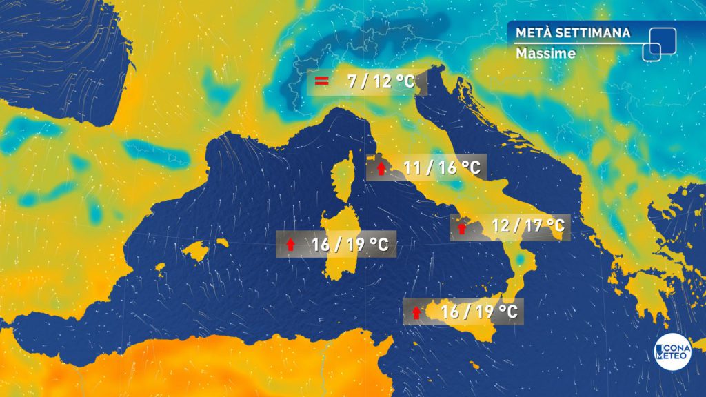Nella giornata di mercoledì 16 dicembre i valori minimi saranno in generale rialzo. Le massime pomeridiane saranno in leggero aumento al Nord, senza grandi variazioni altrove. Al Centro-Sud valori per lo più tra 14 e 18 gradi ma con punte nuovamente intorno ai 19-20 gradi sulle Isole maggiori.
