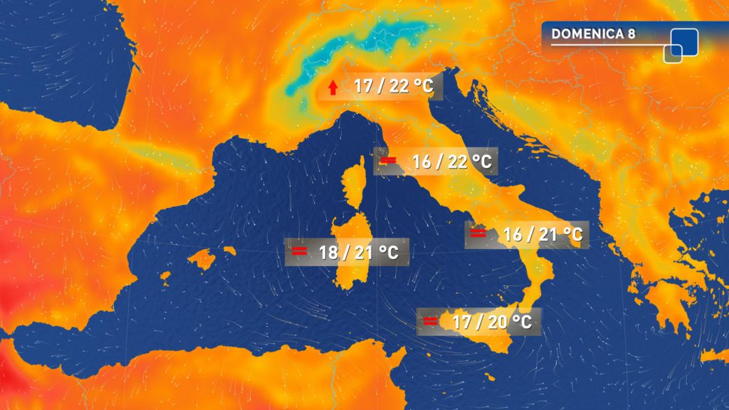 Temperature massime quasi ovunque in rialzo, più marcato al Centro-Nord, dove saranno possibili punte dai 22 ai 26 gradi.