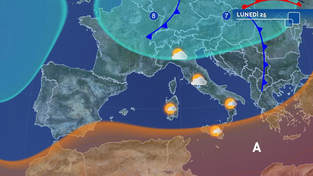 Tempo prevalentemente soleggiato al Sud e in Sicilia. In Sardegna locali annuvolamenti sul nord dell’isola, accompagnati da qualche piovasco isolato nel nordovest al mattino. Al Centro-Nord prevarranno i cieli nuvolosi, con temporanee schiarite, specie sull’estremo Nordovest, nel Lazio e in Abruzzo; l’atmosfera risulterà instabile con rischio di piogge sparse, anche a carattere di rovescio o temporale, più probabili su centro est Lombardia, regioni nord orientali, Liguria di levante e Toscana. Nel tardo pomeriggio rovesci sparsi e possibili temporali isolati su Umbria, Marche, Lazio centro settentrionale. Limite della neve sulle Alpi sopra 1600 e 1800 m. Nel corso della sera fenomeni quasi ovunque in esaurimento.