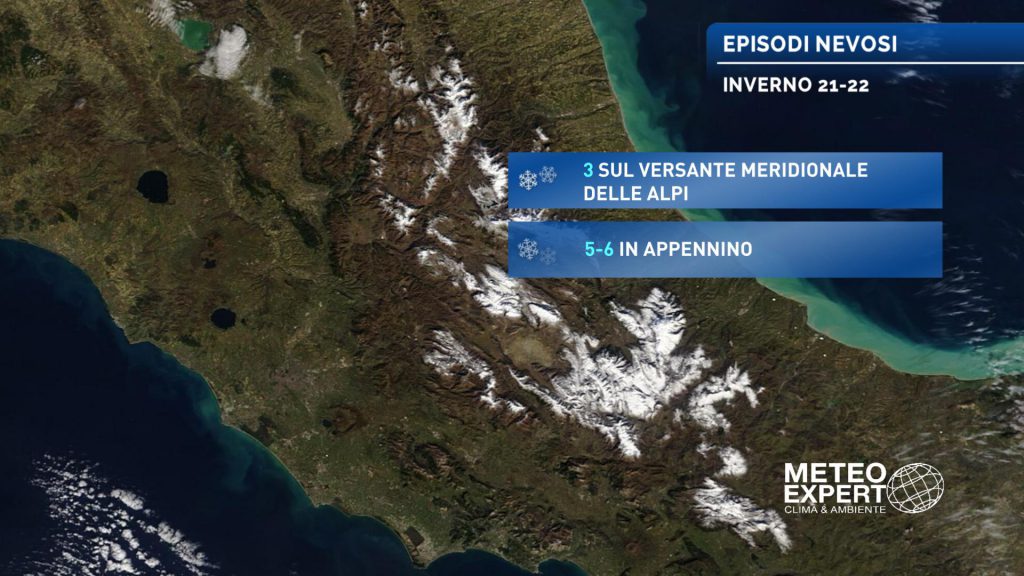 «Per quanto riguarda gli episodi di neve in montagna possiamo complessivamente ridurre a 3 gli episodi di neve sulle Alpi meridionali. Sul versante estero delle Alpi, la situazione è stata molto diversa, infatti. Per l’Appennino contiamo 5-6 episodi al massimo, tutti di modesta entità, con accumuli poco rilevanti».
