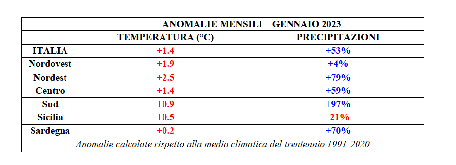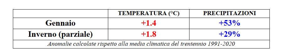 L’inverno ancora in corso, infatti, segna al momento un primato dal punto di vista termico: il bimestre dicembre-gennaio risulta essere il più caldo della serie storica con un’anomalia di +1.8°C, valore che oltrepassa anche l’analogo bimestre del 2006-2007 (una stagione invernale eccezionalmente calda in quell’anno talvolta ricordato come l’“anno senza inverno”).