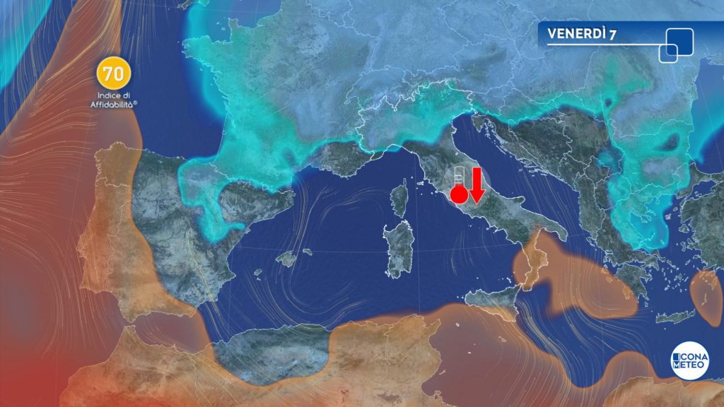 Da venerdì, invece, si profila un cambiamento significativo a causa dell’arrivo di un impulso di aria molto fredda verso il Mediterraneo con un coinvolgimento soprattutto delle nostre regioni settentrionali. Già da venerdì ci si aspetta un peggioramento del tempo, in particolare nelle regioni nord-occidentali e in Toscana, con possibilità di neve a quote collinari e anche localmente di pianura sulle regioni di Nordovest.